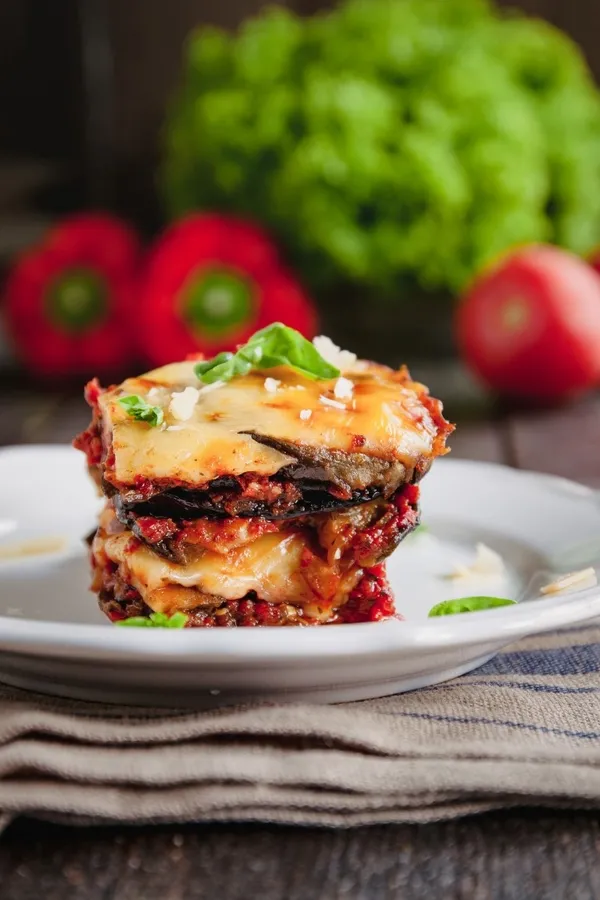- Her katmanda bir dilim patlıcan, bir kat domatesli karışım ve bir miktar kaşar peyniri olacak şekilde düzenleme yapın. En üst kata ince dilimlenmiş kaşar peyniri serpin.
